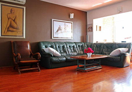 A large living room with a sofa that can be extended and offer an extra bed for 2 persons