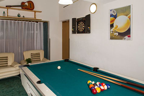 The house consists of 5 bedrooms, a kitchen with a living room, and 2 bathrooms. A game room with a billiards table and darts is also available.
