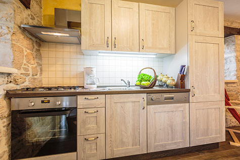 The ground floor offers a nice living area with a fire place and fully equipped kitchen opening onto the terrace and the garden.