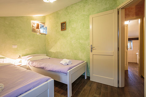 Two bedrooms are on the upper floor, one with a double bed and the other one with two singles beds which can be putted together if needed.
