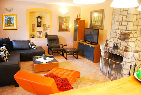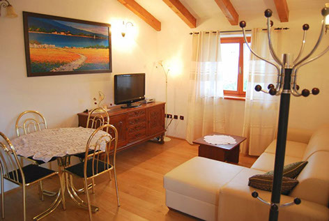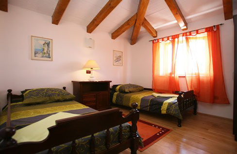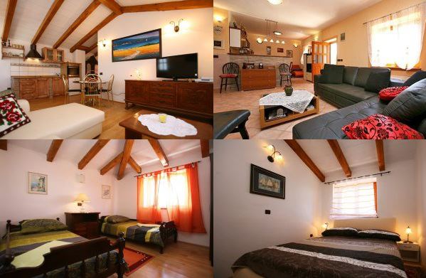 On the upper floor is an apartment with two bedrooms (one bedroom with a double bed and second bedroom with two single beds), a living room with a sofa bed for 2 persons, equipped kitchen and bathroom.
