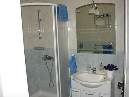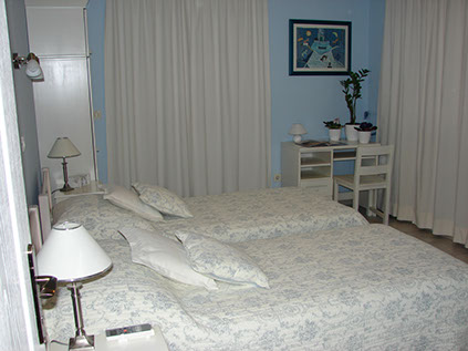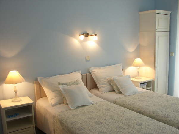- Blue Bedroom with two beds, bathroom with shower, sink, wc, bidet, hairdryer, air conditioning - cooling & heating. Covered balcony