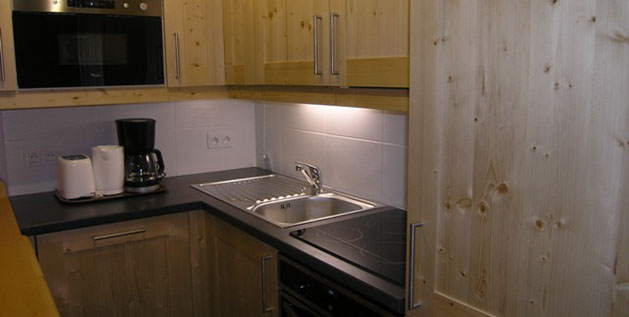 First level: living area with trundle beds (2x1 person), equipped kitchen, bedroom with double bed, bathroom.