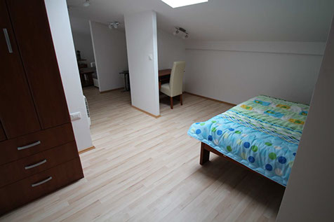 Modern studio apartment (44m²) with a sleeping area with a double bed and bathroom.