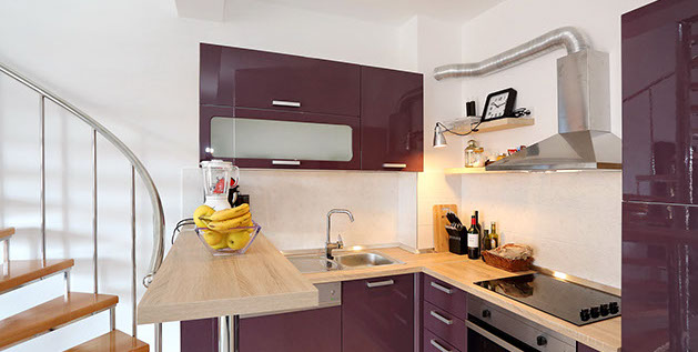 On the first level, a large living room opening to a balcony with outdoor furniture, a fully equipped kitchen, guest toilet.