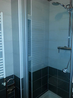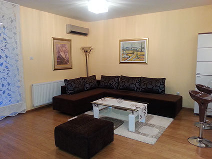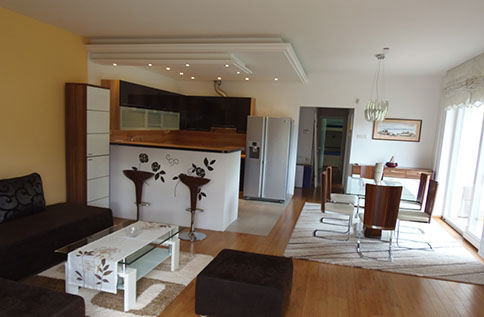 Nice furnished apartment offering 120m² of living space: large living room with fully equipped modern kitchen and dining area opening onto balcony and terrace, 3 bedrooms (one master bedroom with exist to a small garden, one bedroom and one smaller bedroom that can be used as a working room), a small bathroom with shower and a second bathroom with Jacuzzi bathtub, wardrobes.