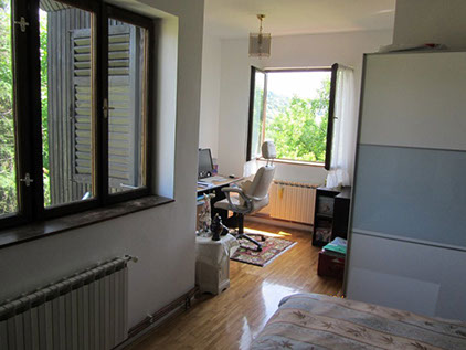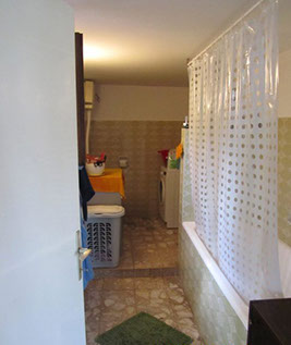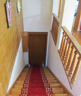 Upper floor: second entrance with balcony, living room, 3 bedrooms and small bathroom.
